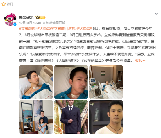 曾经因为《天国的嫁衣》《绿光森林》等偶像剧走红的知名男星立威廉,在今年夏天确诊甲状腺癌二期。他本人透露:9月,进行了2次手术,切除了3厘米和1.1厘米的两个肿瘤。医生评估,目前99%的肿瘤已被切除。尽管手术成···......[详情]